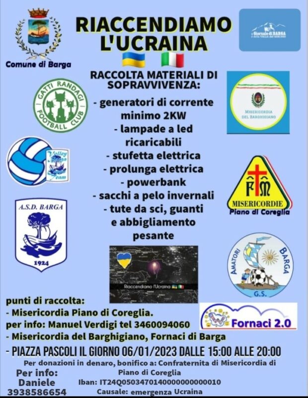 Tante realtà stanno collaborando: oltre alla Misericordia di Piano di Coreglia ed alla Misericordia del Barghigiano, le squadre dei Gatti Randagi di Barga, del Volley Barga, l’AS Barga, il GS Barga amatori oltre a Fornaci 2.0 ed anche il comune di Barga ed il Giornale di Barga. Si punta come già reso noto a raccogliere tutti quei materiali che possano permettere ad un famiglia, a tante famiglie, di superare l’inverno. Un vero e proprio kit di sopravvivenza… Per questo si richiedono in particolare generatori di corrente a 220 v (minimo 2 kw); stufette elettriche; lampade a led ricaricabili, powerbank, prolunghe. Tutto quello che insieme ad un generatore permetta ad una o più famiglie di scaldarsi e non rimanere isolata dal resto del mondo ricaricando così anche i propri telefoni cellulari; si richiedono inoltre sacchi a pelo invernali, tute da sci, abbigliamento pesante, guanti, coperte, materiali caldi. In questo caso, si richiede che sia tutto in buone condizioni e pulito; pronto all’uso. Venerdì 6 gennaio, in piazza Pascoli a Barga, nel giorno dell’Epifania, ci sarà anche una giornata di solidarietà: dalle 16 alle 20 sarà possibile recare il materiale che si vuole donare. Per consegnare il materiale ci sono anche due punti di raccolta: presso la Misericordia di Piano di Coreglia e presso la Misericordia del Barghigiano a Fornaci. E’ anche possibile inviare offerte in denaro (sempre finalizzato all’acquisto di questi materiali). Si può effettuare un bonifico intestato alla Confraternita di Misericordia di Piano di Coreglia (iban: IT24Q0503470140000000000010 – casuale: emergenza Ucraina)