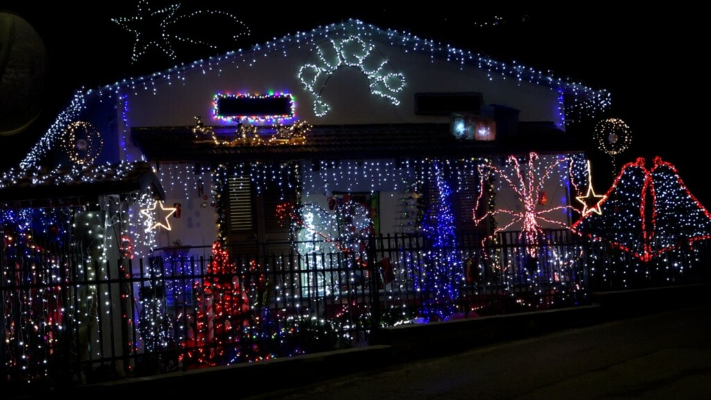 Ci sono stelle, cuori, alberi decorati e poi gli auguri e sul tetto una monumentale stella cometa; a costruire tutto questo è stato Davide Bimbi per soddisfare la passione della moglie Monassita Poli che adora festeggiare il Natale con tante luci natalizie.