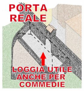 La Loggia occupava più dell’attuale facciata della Porta Reale, ventuno metri e veniva in avanti sino all’inizio del triangolare rivellino per circa cinque metri a comporre un bello stanzone. Tenendo conto che allora la popolazione del Castello, quella maggiormente interessata allo sfruttamento della Loggia a teatro, non raggiungeva le mille anime, pensiamo si sia capito che la grandezza fosse assai bastante per accogliere comodamente del pubblico. L’anno 1676, nel ricorrere il tetto della Loggia, si vide rotta la trave che stava sopra il rivellino, e siccome non se ne poteva trovare in loco una di simile lunghezza che si appoggiasse il tetto sul muro dello stesso rivellino che sarebbe stato rialzato con dei finestroni.