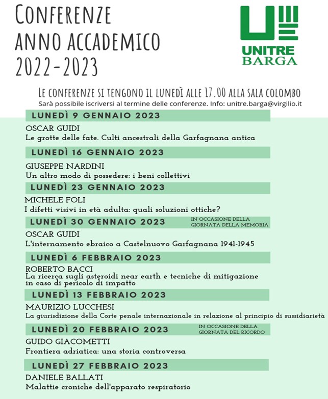 La prima conferenza del 2023, lunedì 9 gennaio, sarà tenuta dal relatore Oscar Guidi che parlerà di “Le grotte delle fate. Culti ancestrali della Garfagnana antica”. Il lunedì successivo si parlerà di “Un altro modo di possedere: i beni collettivi” con Giuseppe Nardini. Michele Foli invece presenterà lunedì 23.01 “I difetti visivi in età adulta: quali soluzioni ottiche?”. Il mese di gennaio si concluderà, in occasione della Giornata della Memoria, con una conferenza toccante sempre del relatore Oscar Guidi “L’internamento ebraico a Castelnuovo Garfagnana 1941-1945”.