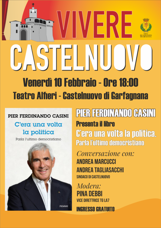 CASTELNUOVO – Venerdì 10 Febbraio alle ore 18 presso il Teatro Alfieri di Castelnuovo di Garfagnana sarà presentato il libro di Pier Ferdinando Casini “C’era una volta la politica. Parla l’ultimo democristiano”. Tra aneddoti, ricordi, riflessioni e speranze, la storia italiana passa attraverso il filo della memoria di uno dei suoi più autorevoli protagonisti che, per la prima volta, ha deciso di raccontarsi e raccontare.