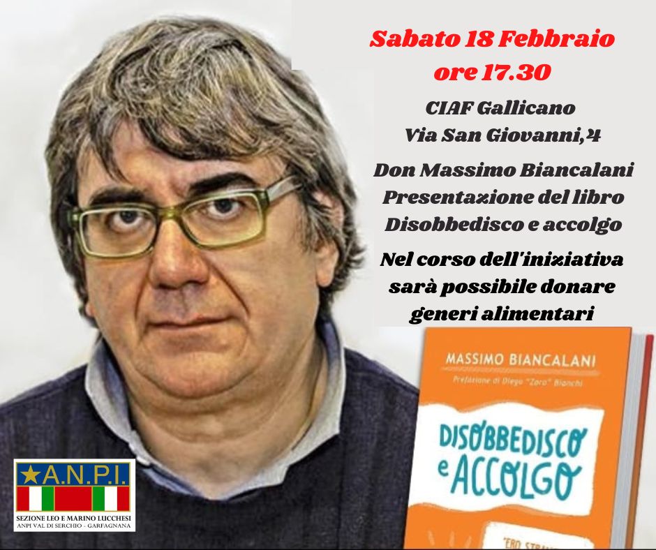 GALLICANO – Sabato 18 febbraio alle 17.30, presso il CIAF di Gallicano (in via San Giovanni, 4), l’Anpi Valle del Serchio organizza la presentazione del libro di Don Massimo Biancalani, Disobbedisco e accolgo.