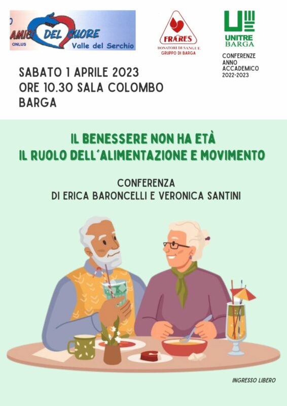 Due professioniste del settore, la Dr.ssa Erica Baroncelli dietista e la Dr.ssa Veronica Santini Medico dello Sport e dell’Esercizio Fisico, con la conferenza organizzata da Unitre Barga “Il benessere non ha età. Il ruolo dell’alimentazione e del movimento” che si svolgerà alla Sala Colombo a Barga alle ore 10,30 sabato 1° aprile, spiegheranno come cambia il corpo con il progredire dell’età e l’importante ruolo dello stile di vita.