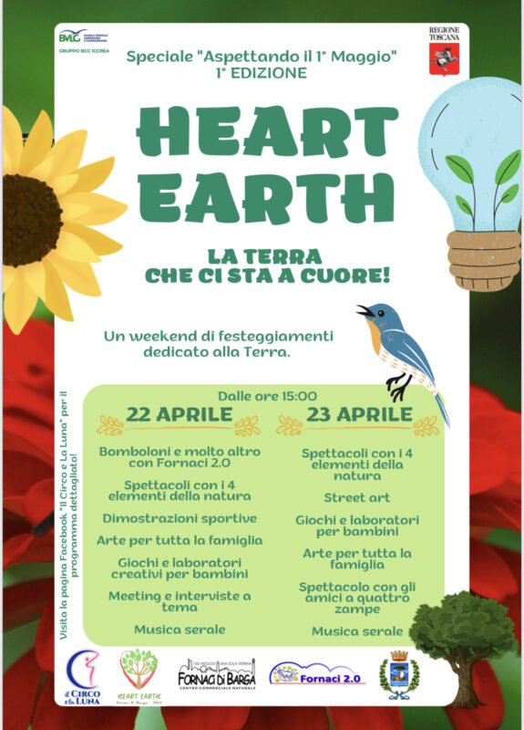 FORNACI – Due giorni per festeggiare la Terra, l’ambiente e il territorio: a Fornaci di Barga arriva la prima edizione di “Heart Earth – La Terra che ci sta a cuore”, la due-giorni dedicata all’ecologia. L’evento, organizzato dall’associazione il Circo e la Luna, Heart Earth, Centro Commerciale Naturale di Fornaci di Barga, Comune di Barga e Fornaci 2.0, con il sostegno della Banca della Versilia, Lunigiana e Garfagnana e il patrocinio della Regione Toscana, coinvolgerà grandi e piccoli nella scoperta di temi urgenti come l’ecologia, il rispetto dell’ambiente e del mondo che ci circonda.