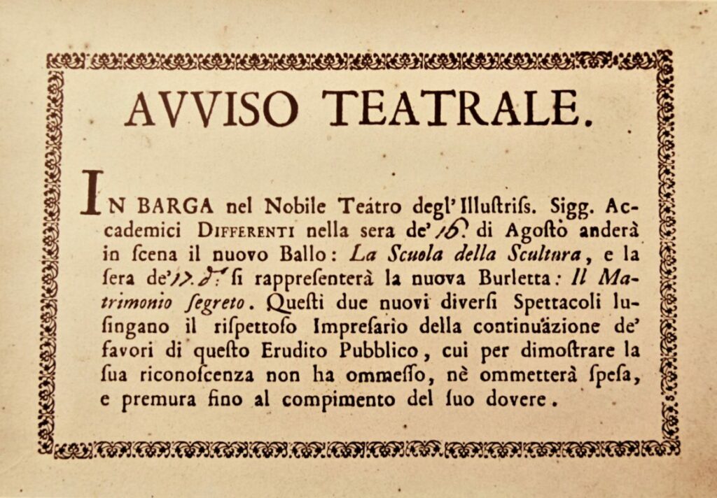 Si passa poi ai rimborsi per lo spartito delle due opere, Il Matrimonio Segreto e il Don Giovanni. La pubblicità con la stampa di 200 copie del manifesto inaugurale che si è visto nella passata decima parte del presente lavoro. La stampa dei libretti di sala delle opere, che vide impegnata la stamperia Bonsignori. Arrivando alla cera, un gran numero di candelotti e poi alcune torce a vento, quest’ultime si presume servissero per illuminare l’esterno del Teatro.