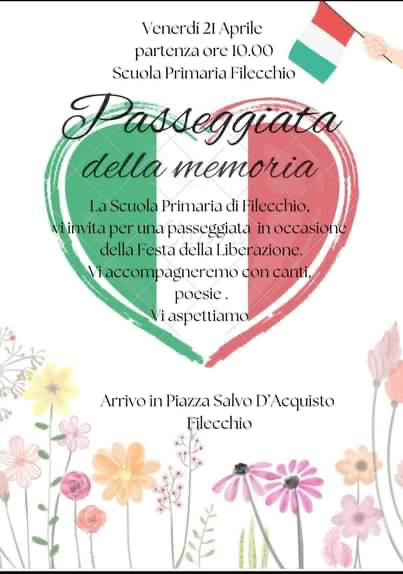 FILECCHIO – Venerdì 21 aprile alla Scuola Primaria di Filecchio (partenza alle 10), si terrò, organizzata dalla scuola, la “Passeggiata della Memoria” per celebrare la ricorrenza del 25 aprile ed il significato di questa data. La Scuola primaria di Filecchio invita la popolazione a questa passeggiata dove accompagneranno i presenti con canti e poesie. Il percorso arriverà dalla scuola fino a Piazza Salvo D’Acquisto.