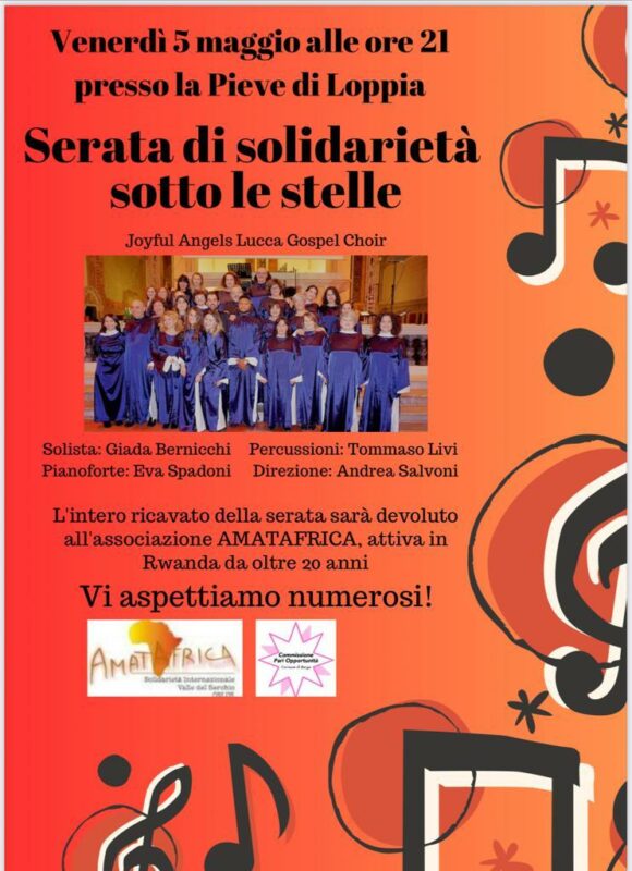 LOPPIA – Venerdì 5 maggio presso la Pieve di Loppia si terrà la “Serata di solidarietà sotto le stelle” promossa dall’Associazione Amatafrica insieme alla commissione pari opportunità di Barga. Protagonisti della serata i cantori della Joyful Angelus Lucca Gospel Choir diretta da Andrea Salvoni, con la partecipazione della solista Giada Bernicchi, di Eva Spadoni al pianoforte e di Tommaso Livi alle percussioni.