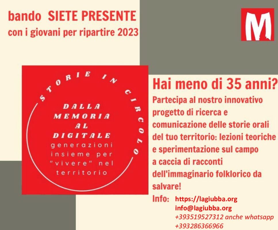 Storie in circolo si rivolge a quei giovani, fra i 16 e i 35 anni d’età, residenti in Toscana, con interessi orientati verso le tradizioni popolari, i beni culturali, l’antropologia, la ricerca di gruppo e la sperimentazione di nuove competenze tecnologiche. Il corso si svolgerà da fine di giugno ad inizio settembre 2023 per la durata complessiva di 120 ore, di cui 42 in presenza, con rimborso spese. Termine ultimo di iscrizione alle selezioni: 11 giugno 2023, compilando il modulo al link https://bit.ly/storieincircolo.