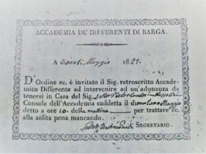 Gli inviti dell’Accademia, di solito, erano eleganti biglietti con cui, vedi immagine, l’Accademico Differente era invitato presentarsi a casa del Sig. Dott. Pietro Cardosi Mazzolini, Console dell’Accademia suddetta il dì ventuno maggio del 1829 alle ore dieci della mattina per trattare, ecc., alla solita pena mancando. Dott. Bartolomeo Guidi Segretario.