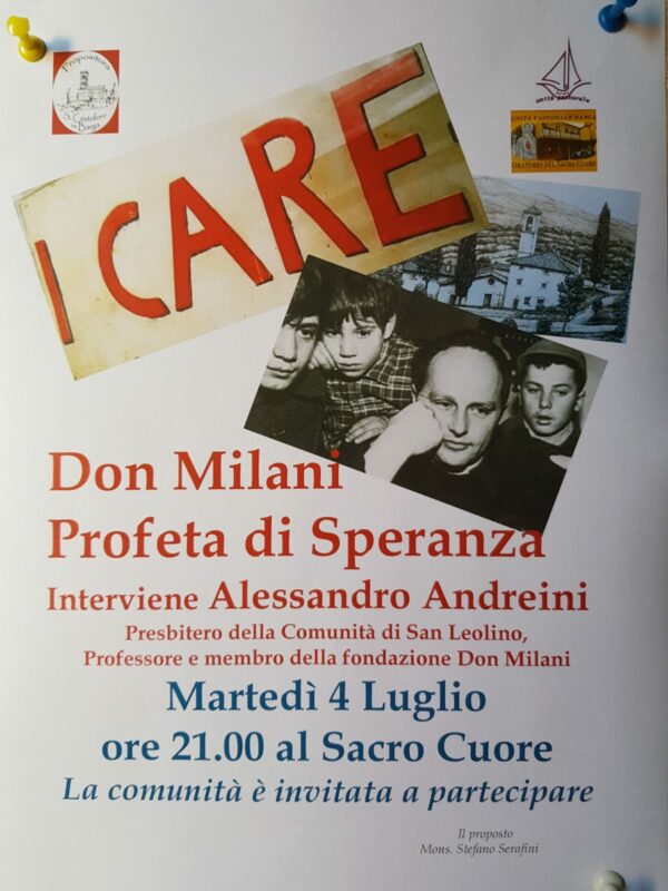 BARGA – I Care. Don Milani, profeta di speranza. Su questo tema martedì 4 luglio alle 21, presso l’oratorio del Sacro Cuore, parlerà Alessandro Andreini, presbitero della comunità di San Leolino e professore e membro della fondazione Don Milani. L’incontro è organizzato dalla Unità Pastorale di Barga.