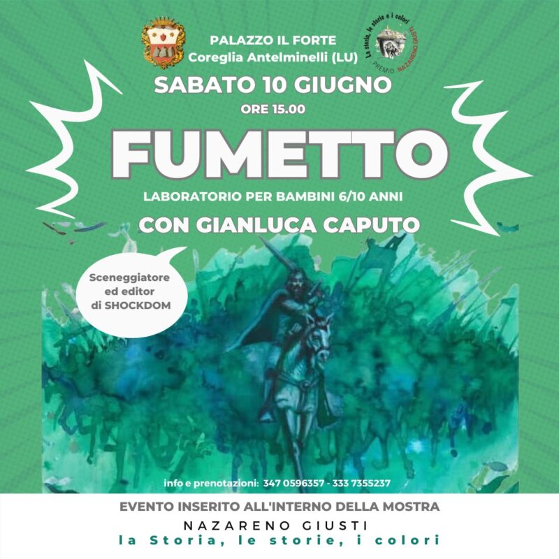 Domani, sabato 10 giugno, alle 15, al Palazzo Il Forte, ci sarà un laboratorio di fumetto promosso dal Comune di Coreglia Antelminelli e da Venti D’Arte. A guidare il pomeriggio dedicato ai bambini da 6 a 10 anni sarà Gianluca Caputo, sceneggiatore ed editor di Shockdom. Un’occasione unica dove i più piccoli potranno mettersi alla prova con l’arte del fumetto, con i suoi colori e con le sue tante sfaccettature. Per informazioni e prenotazioni sul laboratorio: 347 0596357 – 3337355237.