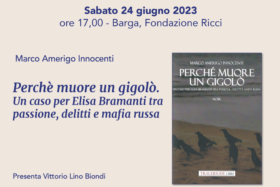 BARGA –Sabato 24 Giugno 2023 alle ore 17.00alla Fondazione Ricci di Barga, in via Roma 20, si terrà la presentazione del libro Perchè muore un gigolò. Un caso per Elisa Bramanti tra passione, delitti e mafia russa di Marco Amerigo Innocenti.