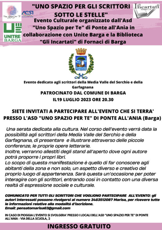 PONTE ALL’ANIA – L’ASD “Uno Spazio per Te” di Ponte all’Ania in collaborazione con Unitre Barga, la biblioteca “Gli Incartati” di Fornaci di Barga e il Comune di Barga, organizzano “Uno Spazio per gli Scrittori sotto le Stelle” un evento letterario dedicato agli scrittori provenienti dalla Mediavalle del Serchio e dalla Garfagnana che si terrà nel giardino dell’associazione in Via della Scuola 2, mercoledì 19 luglio 2023 dalle ore 20,30. Una serata letteraria sotto le stelle aperta a tutti durante la quale sarà possibile incontrare gli autori locali, sfogliare le loro opere esposte presso degli stand appositamente organizzati ed ascoltare delle minipresentazioni delle opere scelte attraverso brevi interviste. Una piccola “Fiera del Libro” ideata dalla scrittrice Marisa Pensato per fare conoscere un aspetto diverso e creativo del proprio luogo di appartenenza. Tutti gli scrittori interessati a partecipare all’evento potranno contattarla direttamente al numero 3463512087 o scrivere una mail a pensatomarisa63@gmail.com