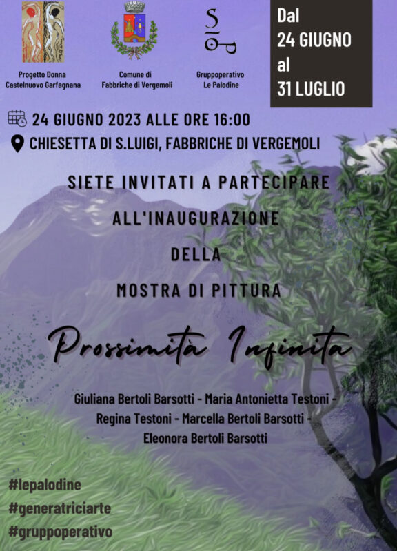 Verranno esposte le opere di Giuliana Bertoli Barsotti, Maria Antonietta Testoni, Regina Testoni, Marcella Bertoli, Barsotti Eleonora, Bertoli Barsotti nell’ambito del progetto estivo “Laboratori creativi nel paesaggio montano”.