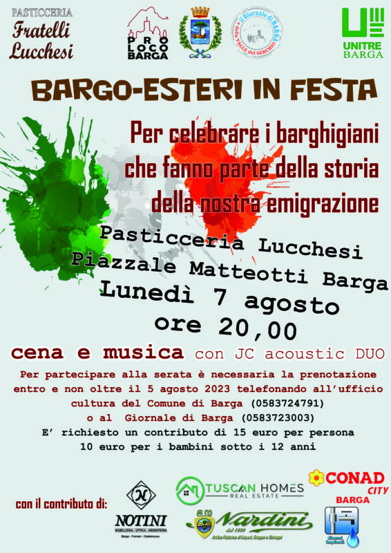 BARGA – Ad agosto ritorna il tradizionale appuntamento con la festa dei Bargo-Esteri che dallo scorso anno ha cambiato nome e si chiama “Bargo-Esteri in festa”. A tutti i barghigiani che hanno vissuto all’estero, a tutti i barghigiani di rientro in queste settimane dall’estero l’invito a partecipare a questa cena con intrattenimento musicale in programma il 7 agosto prossimo.