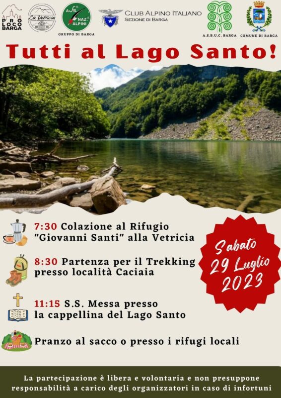 Pro Loco Barga, Rifugio La Vetricia, Comune di Barga, comune di Pievepelago, gruppo alpini di Barga, sezione di Barga del Cai, Asbuc Barga propongono così “Tutti al Lago Santo” una bella giornata che inizierà alle 7,30 con la colazione al Rifugio Giovanni Santi alla Vetricia (ore 7,30); poi la partenza per il trekking che avverrà dalla località Caciaia alle 8,30. Alle 11,15 la Santa Messa presso la cappellina degli Alpini al Lago Santo e di seguito il pranzo al sacco o presso i rifugi presenti sul Lago.