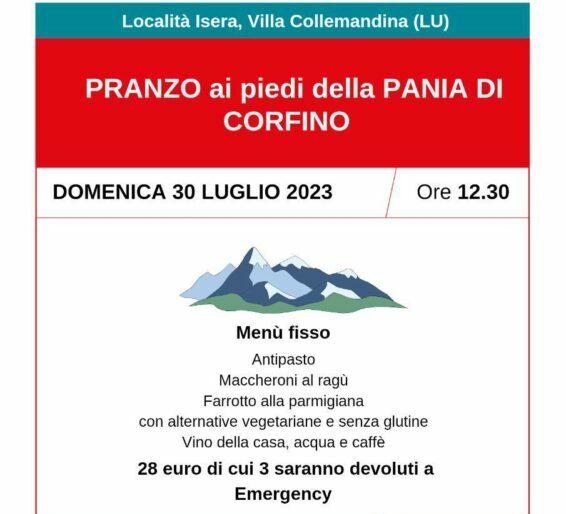 CORFINO – Domenica 30 luglio il gruppo di volontari Emergency Media Valle e Garfagnana organizza un pranzo presso il Rifugio Isera Orecchiella. L’appuntamento è alle 12.30, il pranzo prevede un menù fisso con antipasto e due primi, con la possibilità di opzioni vegetariane e senza glutine. Il prezzo fisso è di 28€, di cui 3€ saranno devoluti ad Emergency. Seguiranno attività laboratoriali, letture e musica concernenti l’operato dell’associazione.