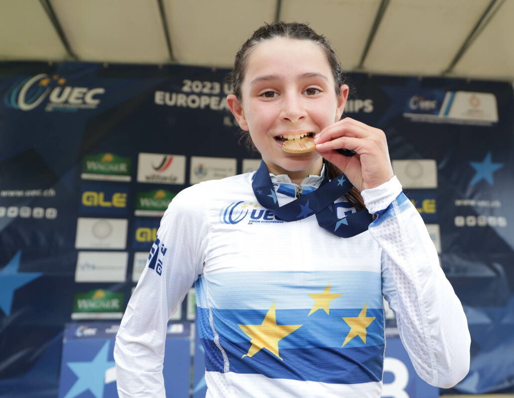 IL CIOCCO –Eccola una bella vittoria azzurra individuale, nell’XCO del Campionato Europeo giovanile nel bike park del Ciocco. L’ha regalata, conquistandola con grande convinzione, l’esile ma determinata bresciana della squadra lombarda Mariachiara Signorelli, della quale con tutta probabilità sentiremo parlare spesso in futuro. Commossa e brava nel cantare l’inno di Mameli, Mariachiara ha vinto la U14 su un percorso tosto che la pioggerellina ha reso anche viscido. Come lei in oro lo svizzero Karim Marwan Barhoumi, che ha vestito la maglia europea anche ieri nello Short Track. Significativo anche il bronzo del leccese Walter Vaglio.