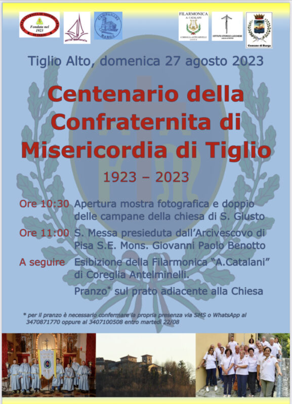 Il primo di questi eventi si svolgerà domenica 27 agosto a Tiglio Alto. La giornata prevede alle ore 10:30 l’inaugurazione di una mostra fotografica dedicata a immagini quotidiane dei volontari della Misericordia e il suono del “doppio” da parte dei Campanari di Barga; alle ore 11 la Santa Messa celebrata dall’Arcivescovo di Pisa S.E. Mons. Giovanni Paolo Benotto e Don Stefano Serafini; a seguire l’esibizione della Filarmonica “A. Catalani” di Coreglia Antelminelli e il pranzo sul prato adiacente alla Chiesa con il supporto degli amici del gruppo Balordi. Per partecipare al pranzo è necessario confermare la propria presenza via WhatsApp o via Sms al numero 3470871770 o al numero 3407100508 entro il 22 agosto.