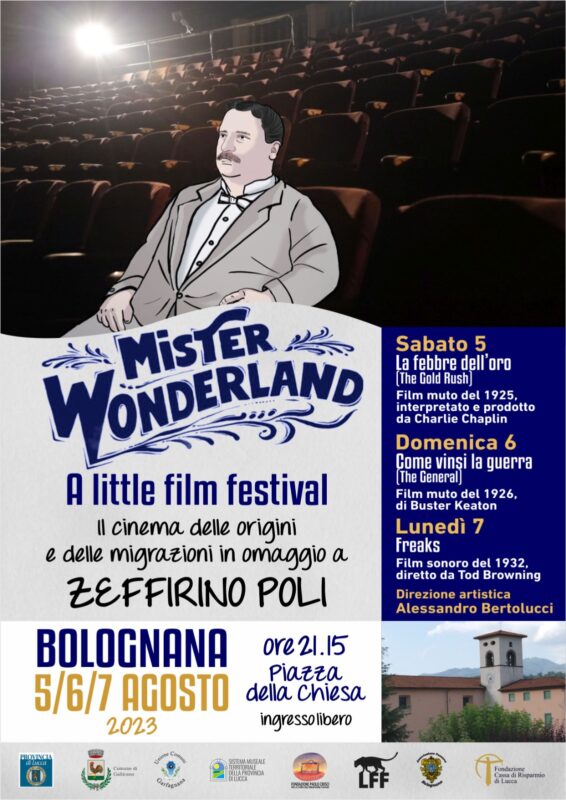 Il festival – che rientra nel programma ‘I Musei del Sorriso’, organizzato dal Sistema Museale della provincia di Lucca – per tre giorni vedrà il cinema muto protagonista a Bolognana nel comune di Gallicano e prende spunto dal documentario di Valerio Ciriaci, realizzato in collaborazione con la Fondazione Paolo Cresci, ‘Mister Wonderland’ (2019 disponibile in streaming su RaiPlay), che – grazie alle ricerche di Luca Peretti – ha permesso di conoscere la vita di Zeffirino Poli, pioniere degli spettacoli di intrattenimento nel Nord America e originario proprio di Bolognana.