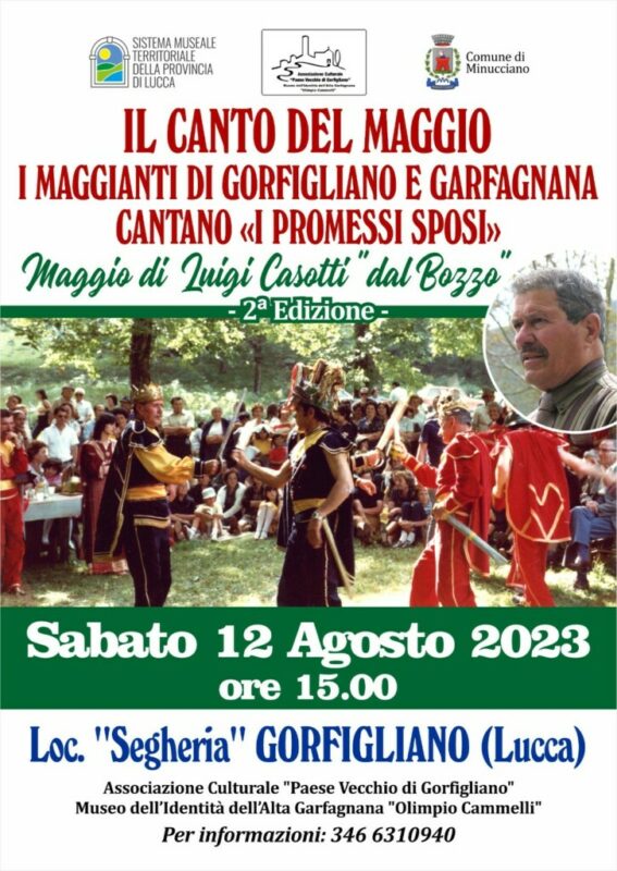 Sabato 12 agosto (ore 15) a Gorfigliano in località Segheria verrà cantato il Maggio “I Promessi Sposi”. Si tratta dell’ultimo Maggio, fino ad oggi mai rappresentato, scritto da Luigi Casotti detto “dal Bozzo” (1940-2009).