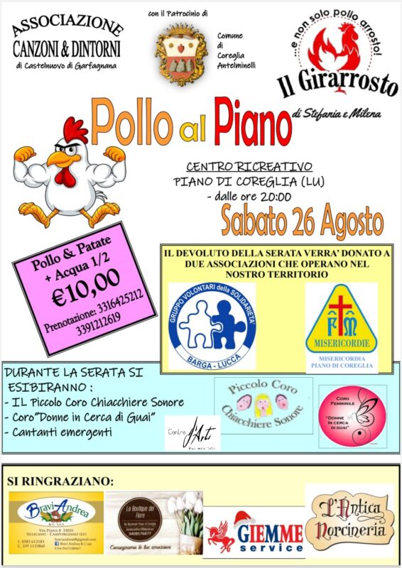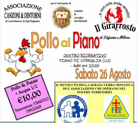 PIANO DI COREGLIA Una cena di beneficenza a favore del Gruppo Volontari della Solidarietà di Barga ed alla Misericordia di Pian o di Coreglia. L’appuntamento benefico è per il 26 agosto prossimo a Piano di Coreglia, presso il Centro ricreativo di San Lorenzo, dove si terrà la prima edizione di: “Pollo al Piano, una serata in compagnia per regalare un sorriso.