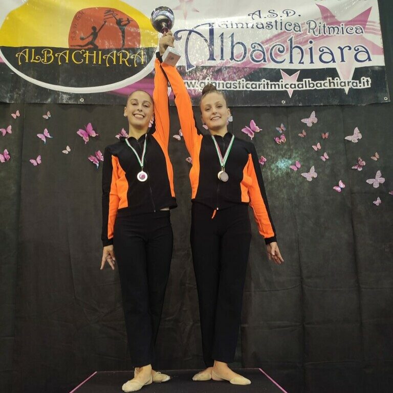 Nell’Insieme Gold, la coppia junior-senior cerchio-palla, formata da Sonia Galli e Rebecca Del Freo convince giuria e pubblico e si classifica al primo posto. Le girasoline disegnano traiettorie vincenti e pulite ed interpretano con brio il brano “Cuore Matto”, meritando ampiamente la medaglia d’oro.