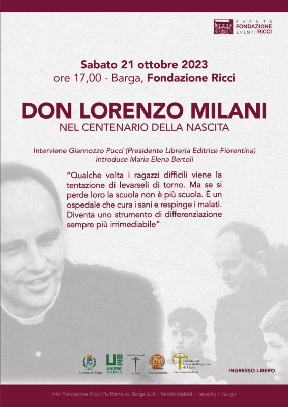 BARGA – Sabato 21 ottobre alle 17:00 a Barga presso i locali della Fondazione Ricci, si terrà un incontro pubblico con Giannozzo Pucci, editore della casa editrice LEF (Libreria Editrice Fiorentina) che da sempre pubblica gli scritti di Don Milani, il quale parlerà di “Don Lorenzo Milani nel centenario della sua nascita”. L’incontro è promosso da Fondazione Ricci, Istituto Storico Lucchese sez. di Barga, Unitre Barga e Comune di Barga.