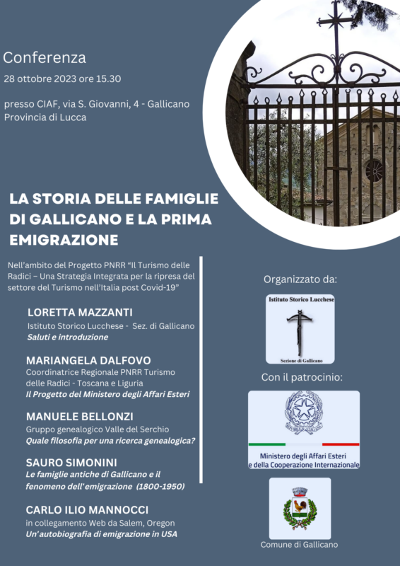 GALLICANO – Organizzata dall’Istituto Storico Lucchese, sezione di Gallicano, si svolgerà sabato 28 ottobre (15,30) al CIAF, in via San Giovanni, 4, la conferenza divulgativa dedicata alla storia delle famiglie gallicanesi nei secoli, con uno spaccato sulla prima emigrazione dell’Ottocento e del Novecento.