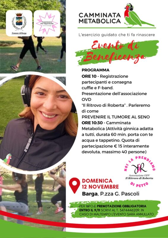 BARGA – La Commissione Pari Opportunità del Comune di Barga e Monia Bernardi, Trainer locale di Camminata Metabolica organizzano, con il patrocinio del Comune, il primo evento benefico in sostegno all’associazione ODV “Il Ritrovo di Roberta” di Pontecosi che si occupa principalmente di prevenzione del tumore al seno e di servizi gratuiti alle persone del territorio che sono state colpite da questa malattia.