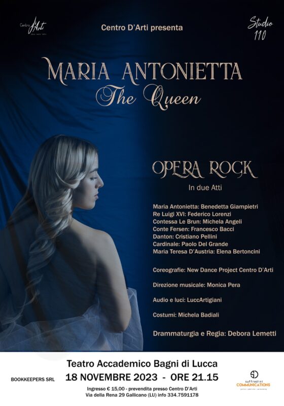 GALLICANO – La scuola “Centro d’Arti” di Gallicano compie 10 anni e per festeggiare porterà sul palco del Teatro Accademico di Bagni di Lucca il musical inedito dal titolo “Maria Antonietta – The Queen”. Si tratta di un’opera rock scritta e diretta dalla direttrice della scuola Debora Lemetti, che ripercorrerà alcuni dei momenti più salienti della vita della Regina di Francia, il tutto accompagnato da brani tra i più celebri dei Queen, che saranno interpretati e coreografati da alcuni degli allievi della scuola. Un progetto nato circa un anno fa, al quale la stessa direttrice tiene particolarmente, poiché riesce a unire le tre discipline del centro d’arti: il canto, la danza e la recitazione. Non è un caso se come mese di debutto sia stato scelto proprio novembre 2023.