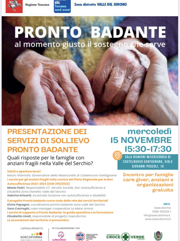 Si svolgerà mercoledì 15 novembre, dalle ore 15.30 alle 17.30 nella sala riunioni della Misericordia di Castelnuovo di Garfagnana, in via Giovanni Pascoli 10, con l’organizzazione dell’Azienda US Toscana nord ovest – Zona distretto della Valle del Serchio in collaborazione con Soecoforma e con tutti i soggetti coinvolti in queste attività, finalizzate a fornire risposte alle famiglie con anziani fragili.