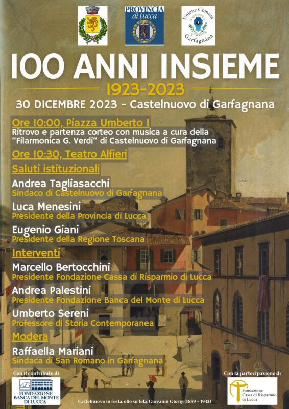 Di questo momento storico si parlerà, dunque, il 30 dicembre al Teatro Alfieri. Il programma prevede alle 10:30, i saluti istituzionali del sindaco di Castelnuovo di Garfagnana, Andrea Tagliasacchi; del presidente della Provincia, Luca Menesini e del presidente della Regione, Eugenio Giani che saranno accolti dalla Filarmonica ‘G. Verdi’ di Castelnuovo di Garfagnana. Seguiranno, quindi, gli interventi del presidente della Fondazione Cassa di risparmio di Lucca, Marcello Bertocchini e da quello della Fondazione Banca del Monte di Lucca, Andrea Palestini e del professore di Storia contemporanea, Umberto Sereni, moderati dalla sindaca di San Romano in Garfagnana, Raffaella Mariani.