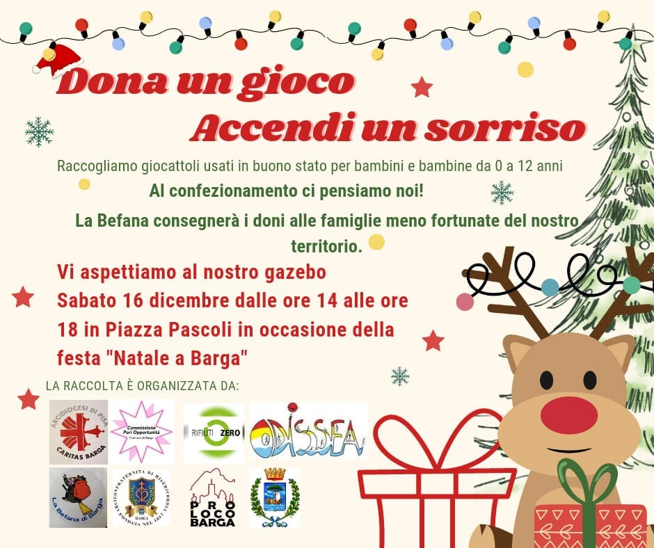 La raccolta si terrà dalle ore 14 alle ore 18 ed è organizzata dalla Caritas Barga, Commissione Pari Opportunità, Osservatorio Rifiuti Zero, Comune di Barga, Cooperativa sociale Odissea, Befana di Barga, Arciconfraternita’ di Misericordia, Proloco