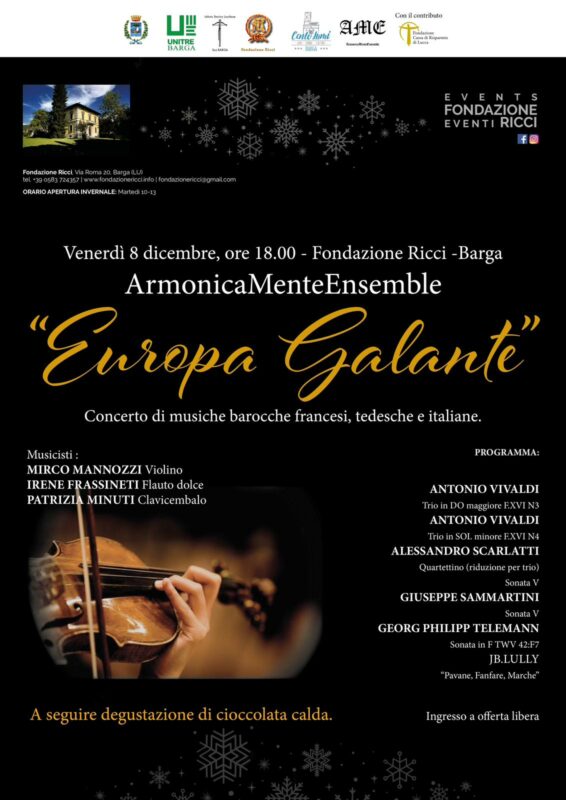 BARGA – Appuntamento con la musica barocca venerdì 8 dicembre alle 18 nella sede della Fondazione Ricci a Barga in via Roma 20. Qui per la prima volta un concerto di musiche barocche italiane, francesi e tedesche sotto il titolo di “Europa Galante” proposto dalla Fondazione grazie alla collaborazione con l’ensemble ArmonicaMente.