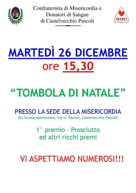 CASTELVECCHIO PASCOLI – Presso la sede della Misericordia e dei Donatori di Sangue di Castelvecchio Pascoli alle ex scuole elementari, ritorna il 26 dicembre la tradizionale Tombola di Natale. Si inizia alle 15,30. In palio ricchi premi.