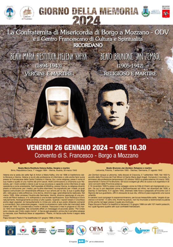 BORGO A MOZZANO – Per il “Giorno della Memoria 2024” la Misericordia di Borgo a Mozzano, in collaborazione con il suo “Centro Francescano di cultura e spiritualità” ha deciso di ricordare quest’anno due figure di religiosi vittime della follia nazista. La Beata Maria Restituita Helena Kafka, vergine e martire, decapitata a Vienna e il Beato Brunone Jan Zembol, religioso e martire, ucciso nel campo di concentramento di Dachau.. Una tradizione della Confraternita iniziata nel 2018, ricordando le figure del francescano Massimiliano Kolbe, di suor Edith Stein nel 2019, del Beato Aniceto Koblin nel 2020, interrotta a causa del covid nel 2021 e 2022 e ripresa lo scorso anno nel ricordo di Fra Sinforiano Ducki, frate francescano cappuccino.
