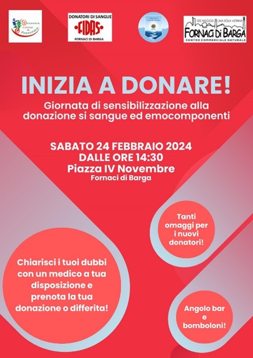 FORNACI – Il gruppo Donatori di Sangue FIDAS di Fornaci di Barga organizza un evento mirato alla sensibilizzazione della popolazione, in particolare a quella di giovane età, dal titolo “Inizia a donare”. Tale iniziativa era stata programmata per lo scorso 8 dicembre ma le avverse condizioni del tempo avevano impedito lo svolgimento. Ora i dirigenti del gruppo hanno deciso di riprogrammare l’evento per questo sabato 24 febbraio in piazza IV Novembre a Fornaci. La manifestazione ha lo scopo di far avvicinare ogni persona sotto i 65 anni ed in buona salute alla Donazione del Sangue. Si ricorda che, pur essendo la nostra zona Valle del Serchio prodiga di donatori, non c’è ancora la autosufficienza in Italia. Quindi l’appello ribadito alla donazione.
