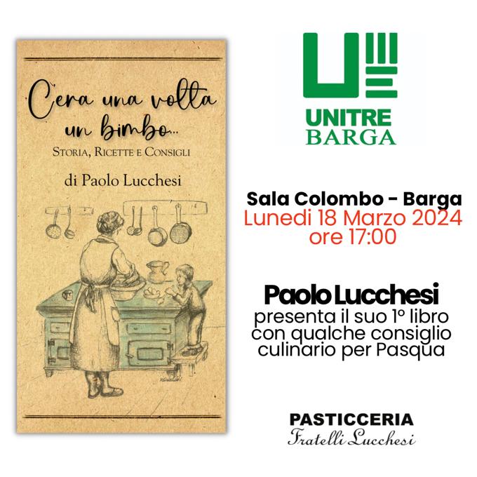 BARGA – “C’era una volta un bimbo… Storia, Ricette e Consigli”. Con il suo libro Paolo Lucchesi continua il suo viaggio di presentazione con l’incontro organizzato da Unitre Barga che si terrà lunedì 18 marzo alle ore 17 presso la Sala Colombo in Via del Giardino 47 Barga.