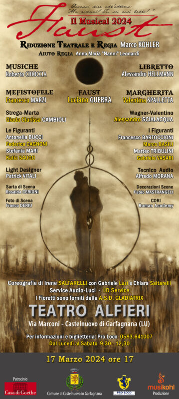 CASTELNUOVO – Domenica 17 Marzo 2024 alle17 presso il Teatro Alfieri di Castelnuovo in Garfagnana debutta il Musical “FAUST”, frutto di 3 anni di lavoro appassionato e appassionante tra il compositore M° Roberto Chioccia, il librettista Alessandro Hellmann e il regista Marco Kohler