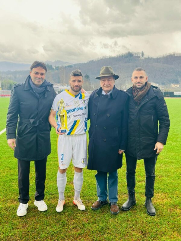 CASTELNUOVO – La partita di ieri tra Castelnuovo e Viaccia è stata l’occasione per celebrare e premiare uno dei giocatori più rappresentativi degli ultimi dieci anni per la squadra gialloblu, il capitano Francesco Inglese. La società ha consegnato, nei minuti precedenti al fischio di inizio, un riconoscimento al calciatore per mano del presidente Francolino Bondi e dei dirigenti Carruezzo, Moriconi e Venturi, per il raggiungimento delle 200 partite con la squadra.