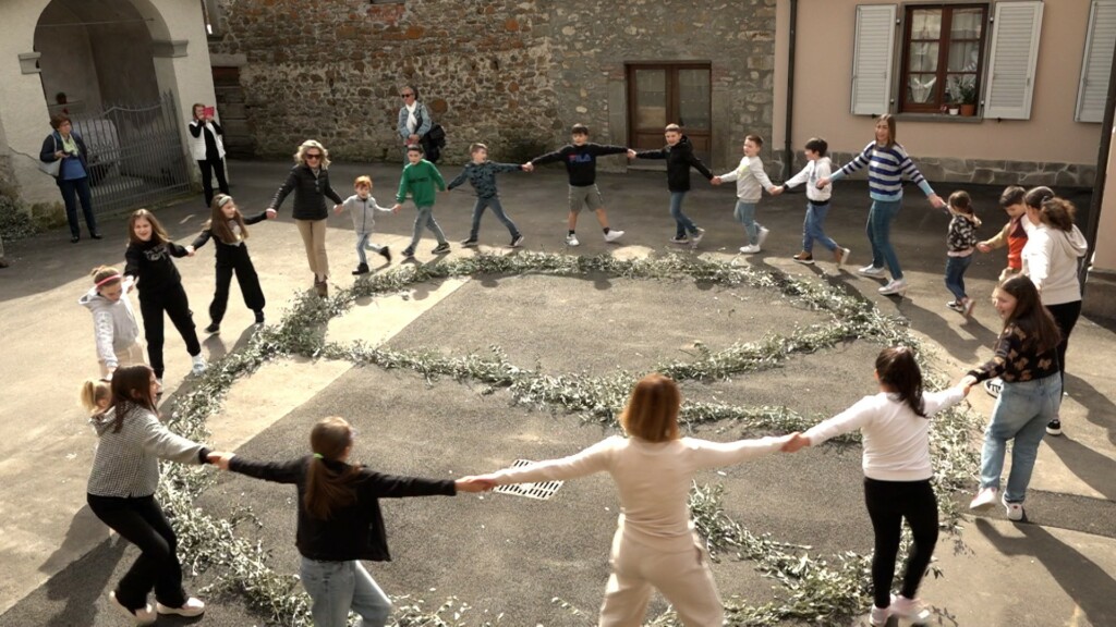 Ad Antisciana i bambini del paese insieme intorno al simbolo della pace realizzato con i ramoscelli di olivo.