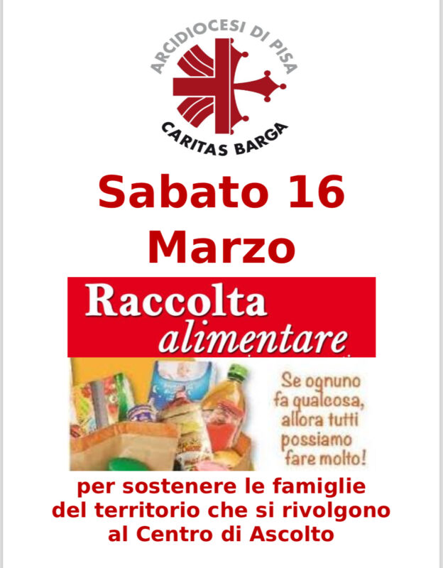 La Caritas Vicariale di Barga organizza per l’intera giornata di Sabato 16 Marzo una raccolta di prodotti alimentari per i pacchi che vengono distribuiti mensilmente alle famiglie incontrate attraverso il Centro di Ascolto.
