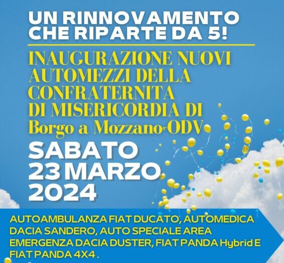 BORGO A MOZZANO – Sabato 23 marzo sarà una giornata di grande festa per la Misericordia di Borgo a Mozzano che inaugurerà cinque nuovi automezzi recentemente acquistati. Una importante operazione di rinnovamento per continuare ad offrire alla comunità servizi sempre pronti ed efficienti. Un’autoambulanza Fiat Ducato, un’automedica Dacia Sandero, un’auto speciale per l’area emergenza Dacia Duster, una Fiat Panda Hybrid e una Fiat Panda 4×4: cinque mezzi che vanno ad aggiornare un parco macchine che oggi ne può contare 34. L’acquisto dei mezzi è stato possibile anche grazie ai generosi contributi ricevuti dalla Fondazione Cassa di Risparmio di Lucca, dalla Banca d’Italia, da alcune aziende del territorio e da privati cittadini.
