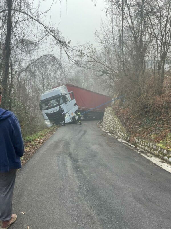Il Tir che vediamo ha sbagliato strada. Stava dirigendosi alla Fassa Bortolo sulla via provinciale per Arni, ma ha imboccato la strada Castelnuovo – Sassi, assolutamente inadatta al transito di mezzi pesanti. Tra l’altro il divieto è ben segnalato.