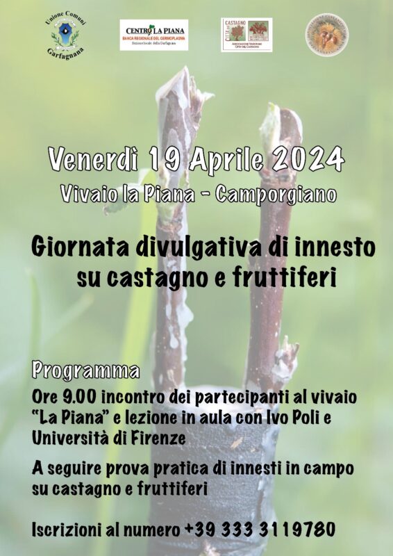 Alle ore 9 è previsto l’incontro dei partecipanti e l’inizio della lezione teorica in aula. Interverranno Ivo Poli, Presidente dell’Associazione Nazionale “Città del Castagno”, e Pietro Castellucci, dottore in Scienze Forestali del Dipartimento DAGRI dell’Università di Firenze. Seguirà quindi la prova pratica di innesti in campo su castagno e fruttiferi.