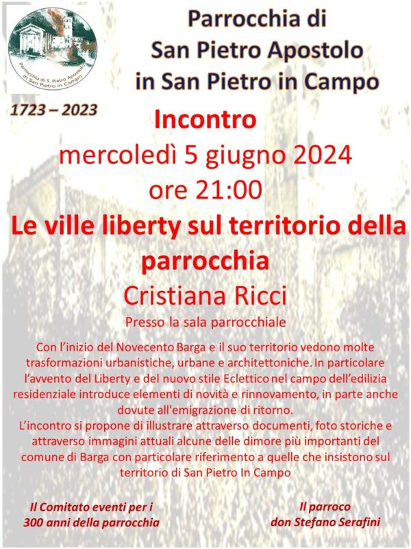 Mercoledì 5 giugno sarà relatrice l’arch. Cristiana Ricci, Presidente della Fondazione Ricci di Barga, che parlerà delle ville in stile Liberty costruite sul territorio della parrocchia. La conferenza nasce dal grande progetto “La nuova Barga”, condotto negli ultimi anni dalla Fondazione Ricci, che ha visto il censimento e lo studio delle ville e villini in stile Liberty ed Eclettico esistenti nel comune. Con l’inizio del Novecento infatti Barga e il suo territorio videro molte trasformazioni urbanistiche, urbane e architettoniche. In particolare l’avvento del Liberty e del nuovo stile Eclettico nel campo dell’edilizia residenziale introdusse elementi di novità e rinnovamento, in parte anche dovuti all’emigrazione di ritorno.