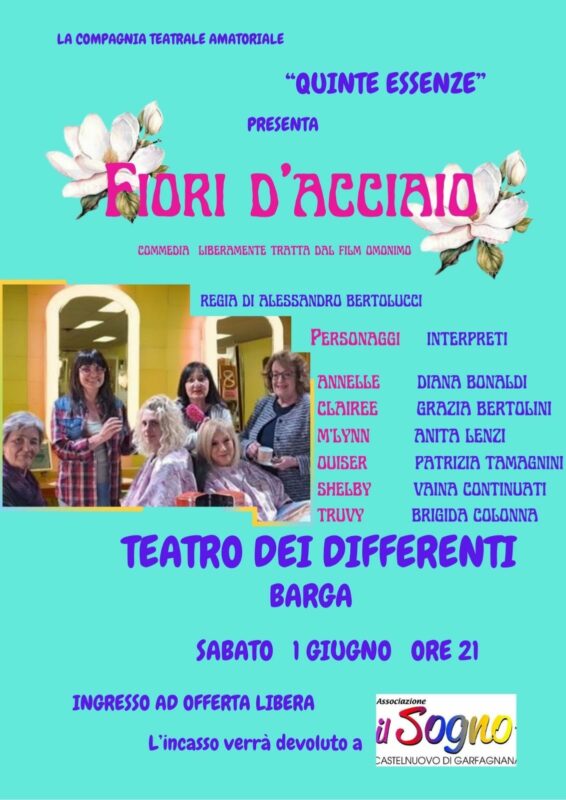 BARGA – La compagnia di teatro amatoriale “Quinte essenze” presenta sabato 1 giugno al teatro dei Differenti di Barga (ore 21), lo spettacolo “Fiori d’acciaio”, commedia liberamente tratta dal film omonimo. Lo spettacolo vede in scena Diana Bonaldi, Grazia Bertolini, Anita Lenzi, Patrizia Tamagnini, Vaina Continuati, Brigida Colonna.