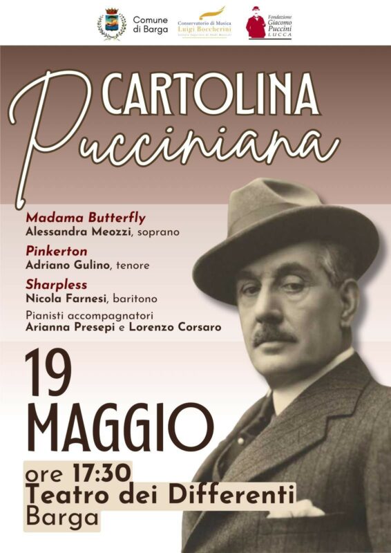 BARGA – A Barga, al teatro dei Differenti, domenica 19 maggio alle 17,30 va in scena “Cartolina Pucciniana”, pomeriggio in musica con protagonisti il soprano Alessandra Meozzi (Madama Butterfly); il tenore Adriano Gulino (Pinkerton), il baritono Nicola Farnesi (Sharpless), con pianisti accompagnatori Arianna Presepi e Lorenzo Corsaro.