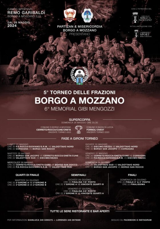 Grande novità dell’edizione 2024, che metterà in palio anche il 6° Memorial “Gibi Mengozzi”, è la disputa della prima edizione della Supercoppa che metterà di fronte la squadra vincitrice del torneo delle Frazioni 2023 e la vincitrice del torneo delle Frazioni di Bagni di Lucca. Domenica 26 maggio alle 20:30 si sfideranno Cerreto/Rocca/Cune/Oneta e Fornoli Ovest.